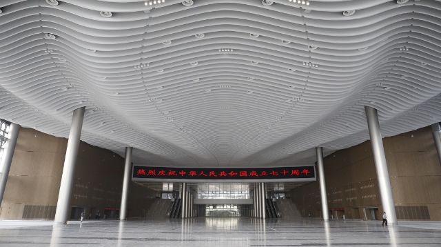 中央廊道和展廳之上,則是擁有超高顏值、可覆蓋106個標(biāo)準(zhǔn)足球場的金屬屋頂。如何讓平淡無奇的屋頂變得漂亮?設(shè)計方介紹,團隊曾經(jīng)嘗試過云海、絲帶、花瓣等多種元素,經(jīng)過多次討論最終確定以海浪為原型,屋面呈現(xiàn)彩色絲帶花紋,寓意“海上絲綢之路”。屋頂?shù)氖┕ね瑯泳媲缶?,在施工過程中,工人通過航拍圖對比效果圖,錯了一塊裝飾板都要更換。