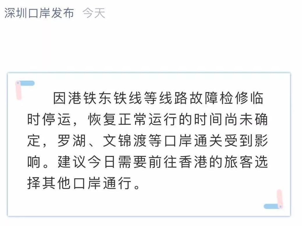 昨天上午11點(diǎn),深圳市口岸辦官方微信號“深圳口岸發(fā)布”發(fā)布消息:因港鐵東鐵線等線路故障檢修臨時(shí)停運(yùn),恢復(fù)正常運(yùn)行的時(shí)間尚未確定,羅湖、文錦渡等口岸通關(guān)受到影響。建議今日需要前往香港的旅客選擇其他口岸通行。