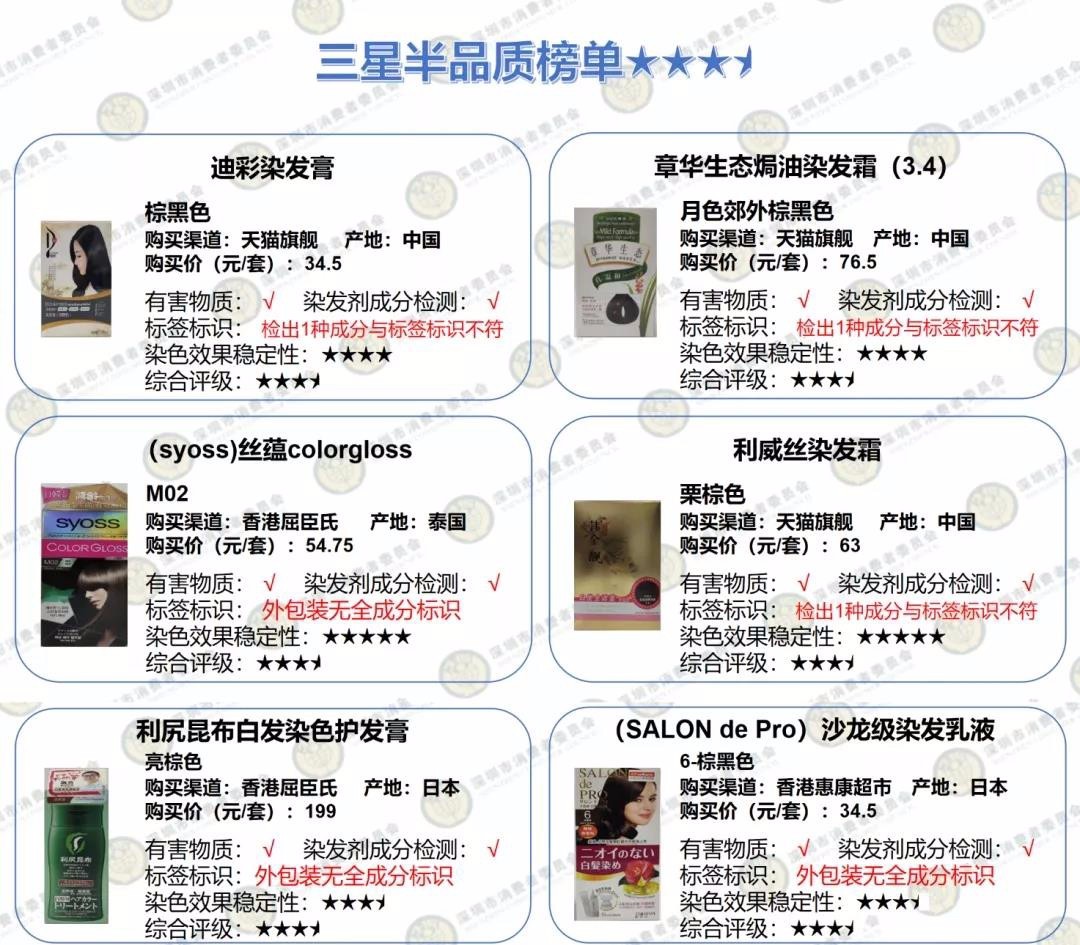 2款染發(fā)產(chǎn)品染發(fā)劑成分檢出量不符合本次比較試驗(yàn)標(biāo)準(zhǔn)要求。此外,多款產(chǎn)品被檢測(cè)出個(gè)別成為與標(biāo)簽標(biāo)識(shí)不符問(wèn)題。