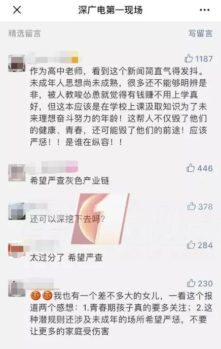 其中一位網(wǎng)友說(shuō):作為高中老師,看到這個(gè)新聞簡(jiǎn)直氣得發(fā)抖。未成年人思想尚未成熟,很多還不能夠明辨是非,被人教唆慫恿就覺(jué)得有錢(qián)賺不用上學(xué)真好,但這本應(yīng)該是在學(xué)校上課汲取知識(shí),為了未來(lái)理想奮斗努力的年齡!這幫人不僅毀了他們的健康、青春,還可能毀了他們的前途!應(yīng)該嚴(yán)懲,是誰(shuí)在縱容!