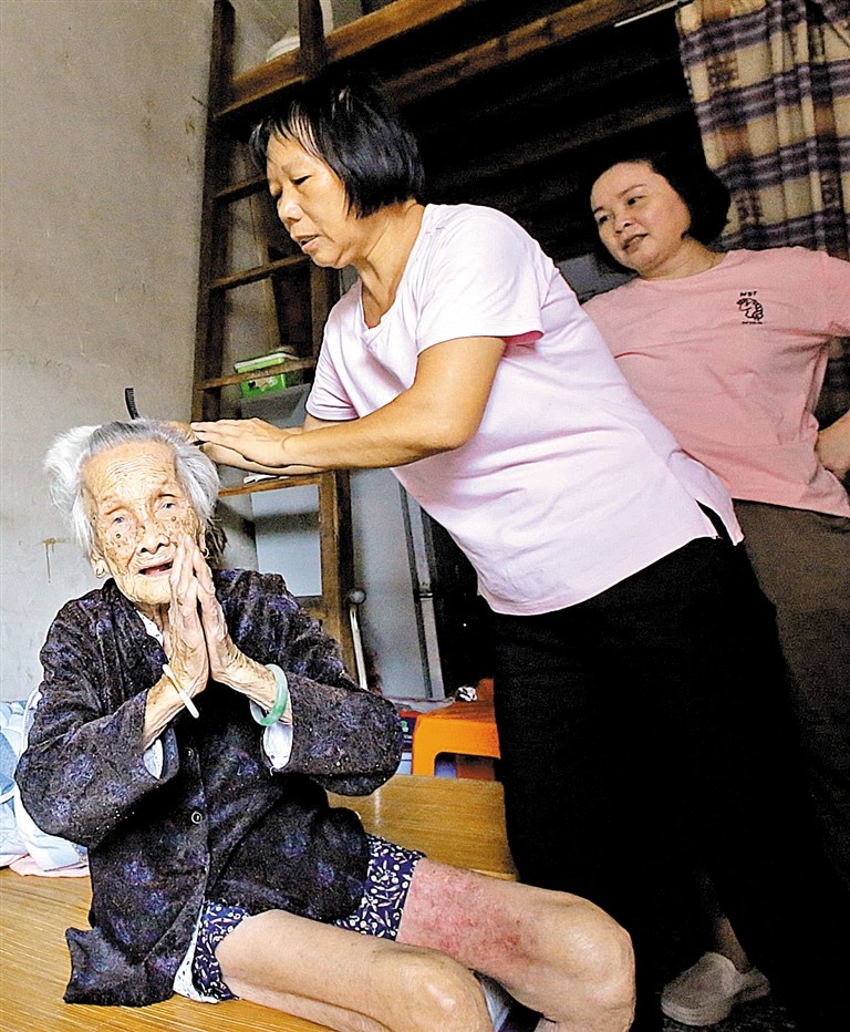 陳汝金老人喜歡打本地花牌,打到了99歲,后來腰部退化,不能久坐,她才沒有再打花牌。吃飯方面,陳汝金也有自己的主張,不求好不求貴,簡簡單單活到老,“外婆以前是生產(chǎn)隊的炊事員,直到去年她還能自己做飯呢?!痹谖男〗憧磥恚绱碎L壽的外婆也沒有特別的養(yǎng)生之道,“保持好心態(tài),順其自然就是最長壽的秘方?!?/p>