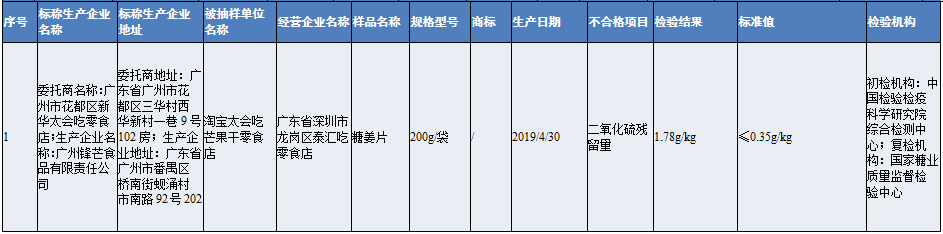 其中,深圳市龍崗區(qū)泰匯吃零食店經(jīng)營的淘寶店銷售的糖姜片,被檢出二氧化硫殘留量不符合食品安全國家標(biāo)準(zhǔn)規(guī)定,存在食品添加劑超限量使用的問題。