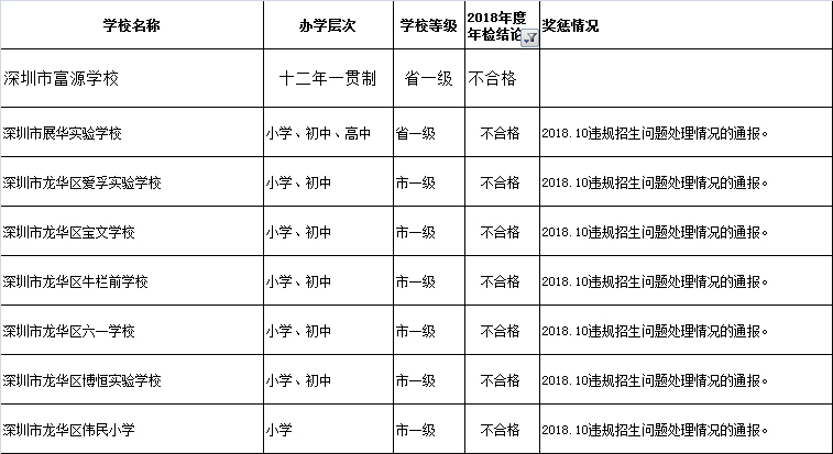 近日,深圳教育局在其官網(wǎng)發(fā)布深圳市民辦中小學(xué)辦學(xué)情況信息公告。最新公告顯示:2018年度年檢結(jié)論為“不合格”的學(xué)校共有8所,“基本合格”的有12所,其他均為“合格”或“不滿一年未年檢”。其中,不合格的8所學(xué)校分別為:深圳市富源學(xué)校、深圳市展華實驗學(xué)校、深圳市龍華區(qū)愛孚實驗學(xué)校、深圳市龍華區(qū)寶文學(xué)校、深圳市龍華區(qū)牛欄前學(xué)校、深圳市龍華區(qū)六一學(xué)校、深圳市龍華區(qū)博恒實驗學(xué)校和深圳市龍華區(qū)偉民小學(xué)。主要涉及違規(guī)招生問題。