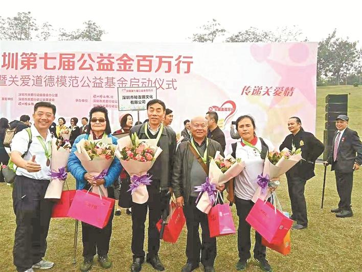 ▲2O18年,吳立民(左四)代表道德模范參加深圳市第七屆公益金百萬行活動。受訪者供圖