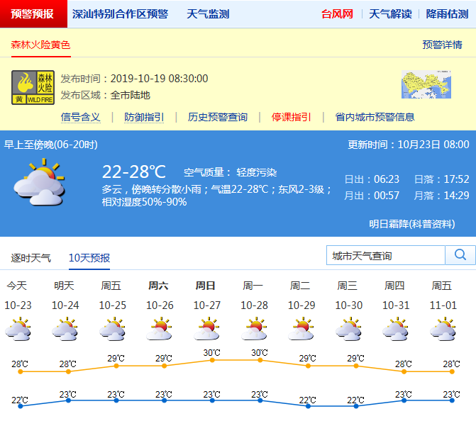 見圳客戶端·深圳新聞網(wǎng)2019年10月23日訊 近期深圳天氣持續(xù)干燥。深圳市氣象臺預(yù)計,23-24日云量增多有分散小雨:23日云量增多,有分散小雨,24日分散小雨轉(zhuǎn)多云,最低氣溫21-22℃、最高氣溫27-28℃;25-29日多云到晴,空氣干燥。