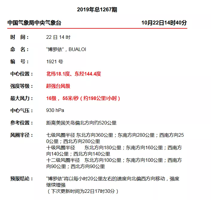今年第21號臺風(fēng)“博羅依”已于10月22日凌晨加強(qiáng)為強(qiáng)臺風(fēng)級,早晨5點(diǎn)鐘其中心位于美國關(guān)島北偏東方向約370公里的西北太平洋洋面上,就是北緯16.7度、東經(jīng)145.5度,中心附近最大風(fēng)力有14級(42米/秒),中心最低氣壓為955百帕,七級風(fēng)圈半徑180-280公里,十級風(fēng)圈半徑100-160公里,十二級風(fēng)圈半徑50-80公里。
