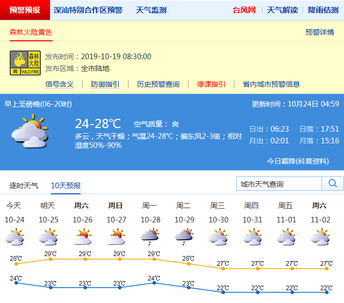 北方因?yàn)榻禍兀藗冊(cè)缫烟咨厦?、穿起秋褲,深圳的小伙伴還在穿著夏裝。昨天白天,全市晴天間多云,早晚較清涼,最低氣溫21℃-23℃,最高氣溫29℃-30℃。全市森林火險(xiǎn)黃色預(yù)警信號(hào)生效中。