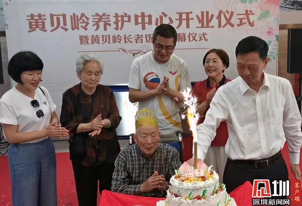 當天下午,在歡樂喜慶的背景音樂中,羅湖區(qū)政協(xié)主席吳裕中、副主席羅安娜,羅湖區(qū)衛(wèi)生健康局局長鄭理光,羅湖區(qū)民政局局長楊文秀,羅湖醫(yī)院集團院長孫喜琢,黃貝嶺靖軒股份公司董事長張偉明一起為黃貝嶺養(yǎng)護中心及黃貝嶺長者飯?zhí)媒遗?。之后,有?3年黨齡的86歲老人惠發(fā)安坐著輪椅,和62年黨齡的83歲老伴張歧蘭一起,伴著推來的生日蛋糕來到揭牌現(xiàn)場,當天正是惠發(fā)安86歲大壽生日,參加開業(yè)儀式的羅湖區(qū)政協(xié)委員、羅湖區(qū)衛(wèi)健局負責人等和現(xiàn)場人員一起,一邊鼓掌一邊唱起生日歌,為老人溫馨慶生。
