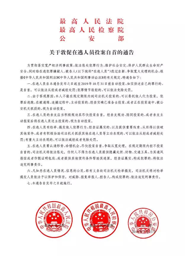 7月24日,公安部新聞發(fā)布會(huì)公布了最高人民法院、最高人民檢察院、公安部聯(lián)合印發(fā)的《關(guān)于敦促在逃人員投案自首的通告》。