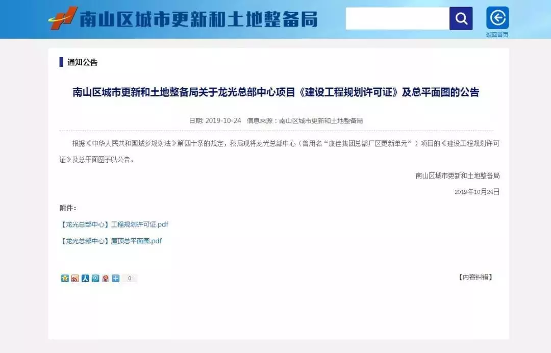 今日,消息報記者從南山區(qū)城市更新和土地整備局發(fā)布的公告上獲悉,原華僑城康佳集團總部廠區(qū)更新單元將建設(shè)龍光總部中心,項目總建筑面積近40萬平方米。