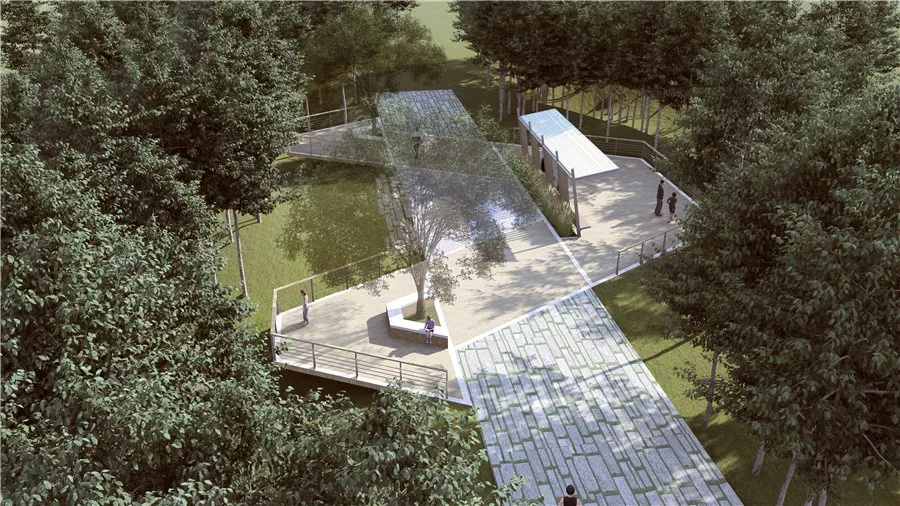 利用現(xiàn)狀平臺(tái)進(jìn)行改造提升,場(chǎng)地形式由“人”字演化而來(lái),廊架也取自“人”形元素進(jìn)行設(shè)計(jì),平臺(tái)北向俯瞰群賢廣場(chǎng),南面則朝向求知花園,具有一攬眾英才之意。
