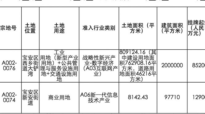 根據(jù)公告,深圳市土地房產(chǎn)交易中心受深圳市規(guī)劃和自然資源局寶安管理局委托,擬出讓寶安區(qū)西鄉(xiāng)街道大鏟灣A002-0076和寶安區(qū)新安街道A002-0074兩宗地。掛牌期自2019年11月20日至2019年11月29日15時(shí)止。(見(jiàn)圖表)