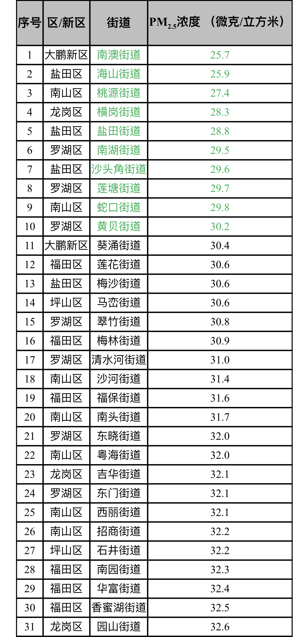 見圳客戶端·深圳新聞網(wǎng)2019年11月5日訊(見圳客戶端、深圳新聞網(wǎng)記者陳婕)11月5日,記者從深圳市生態(tài)環(huán)境局了解到,2019年10月,全市74個街道PM2.5濃度在25.7-40.4微克/立方米之間,均值為33.3微克/立方米。排名前十的是:南澳、海山、桃源、橫崗、鹽田、南湖、沙頭角、蓮塘、蛇口和黃貝等街道,排名倒數(shù)前十的是:新湖、觀瀾、平湖、新安、坪地、公明、福永、大浪、龍城和馬田等街道。