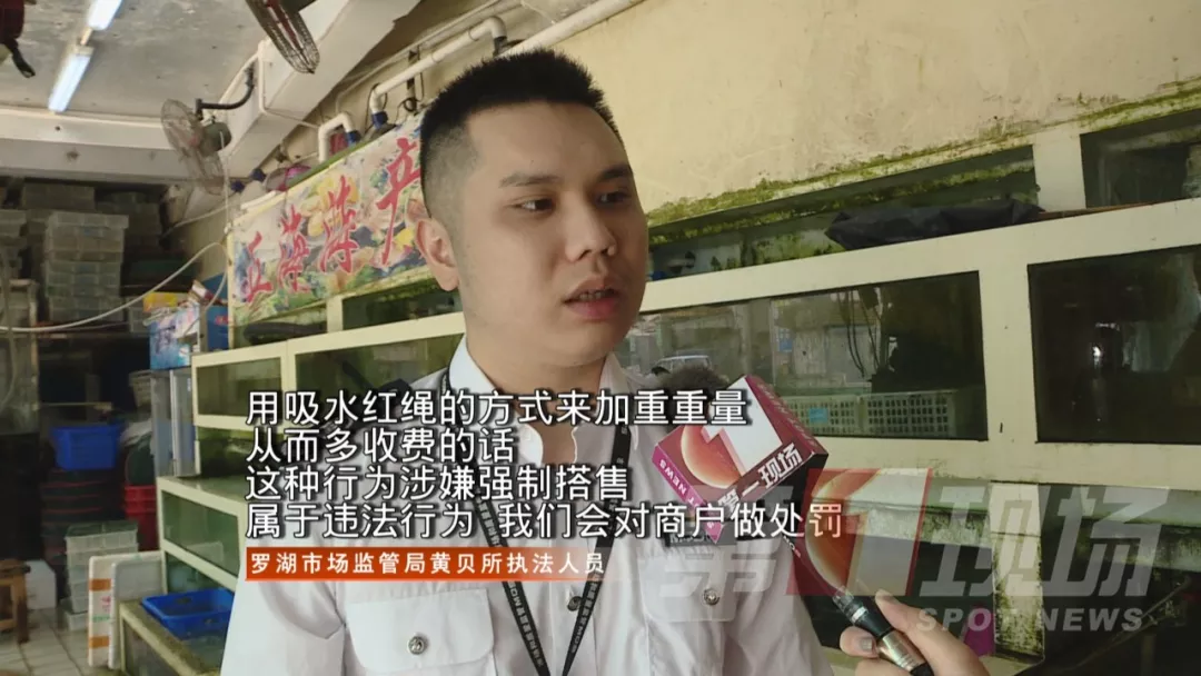 羅芳水產批發(fā)市場商家承認,的確有一些進貨商為了盈利,會要求他們幫忙把紅繩綁上去,或者自己將紅繩加上去的情況,那這一行為是否合規(guī)?記者聯(lián)系了轄區(qū)市場監(jiān)督管理局的執(zhí)法人員到現(xiàn)場。