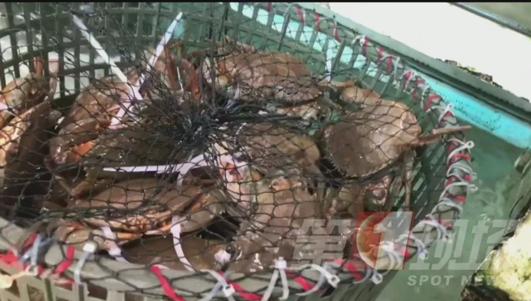▲羅芳水產(chǎn)批發(fā)市場(chǎng)內(nèi),膏蟹用白色塑料繩來捆綁。