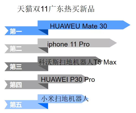 在熱賣的新品種,老廣對華為Mate 30熱情最高,其次是Iphone11 pro。值得一提的是,今年天貓雙11,蘋果官方旗艦店天貓僅用10分鐘,成交額超去年全天7倍。但是,顯然老廣對數(shù)碼產(chǎn)品有自己的看法。熱賣新品TOP5后三席分別是科沃斯掃地機器人T5 Max、華為 P30 Pro和小米掃地機器人,可見老廣對數(shù)碼科技產(chǎn)品比較鐘愛,持家的屬性讓家居類數(shù)碼產(chǎn)品獨受寵愛。
