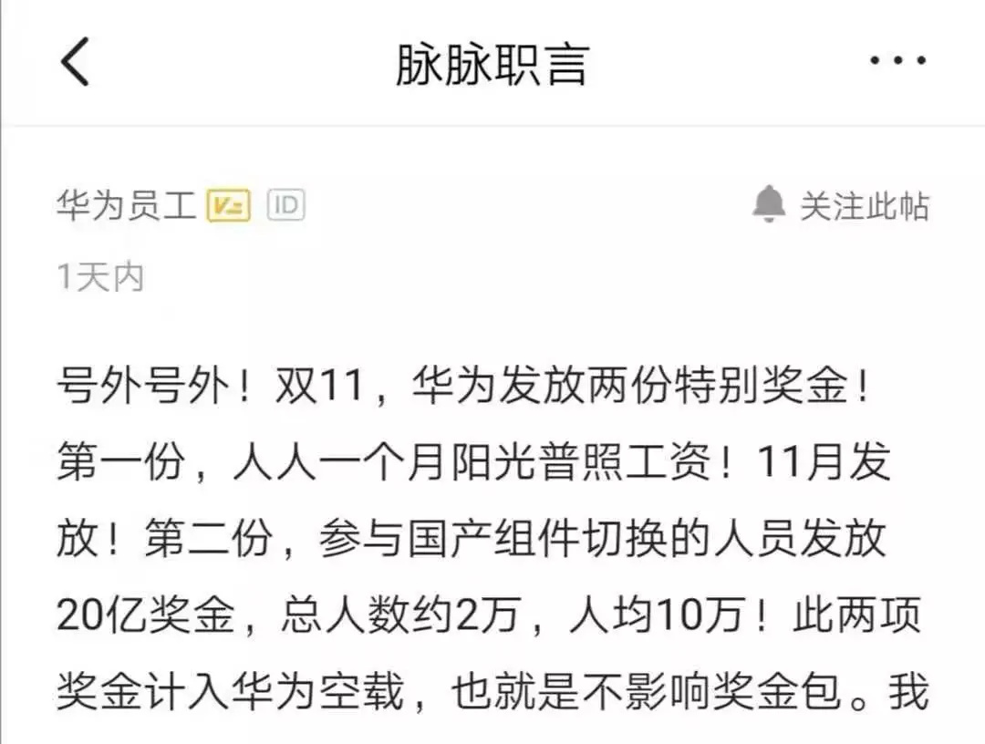 11月11日,據(jù)華為員工在職場社交平臺爆料稱,華為給員工發(fā)放了兩份特別獎金: