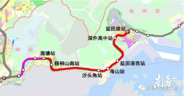 地鐵8號線一期工程,由2號線東延線蓮塘站站后接出,終點(diǎn)設(shè)于鹽田港后方陸域的鹽田路站,線路長約12km,共設(shè)站6座(梧桐山南站、沙頭角站、海山站、鹽田港西站、深外高中站、鹽田路站),全線采用地下敷設(shè);在望基湖設(shè)置一座停車場。