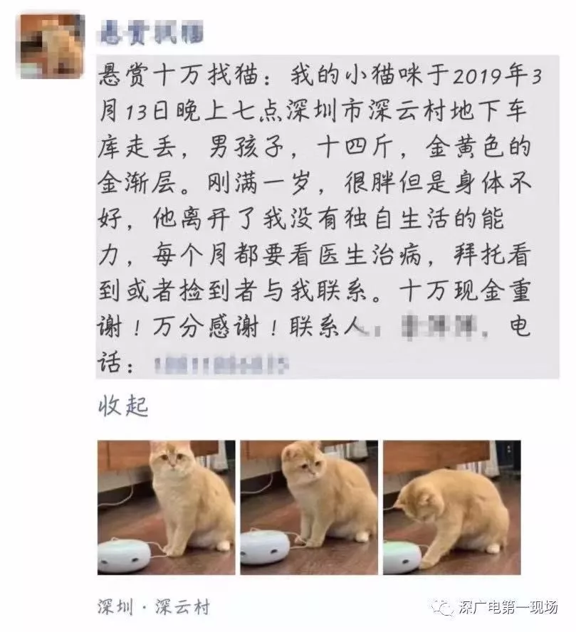 我們欄目之前也報道過此類“重金尋寵物”的事件。今年三月深云村居民李女士在朋友圈發(fā)布“十萬重金尋貓”的啟事。