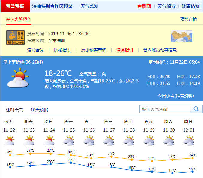 見圳客戶端·深圳新聞網(wǎng)2019年11月22日訊 深圳市氣象局預(yù)計22日晴天干燥,早晚清涼,氣溫18-26℃;23-24日多云間晴天,部分時間有輕霧或霾;25日夜間至26日冷空氣影響,北風(fēng)加大,氣溫略降;展望27日夜間冷空氣繼續(xù)補充,氣溫持續(xù)下降。