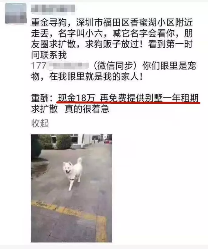 近日,深圳有位狗主人在朋友圈尋狗,重酬的內(nèi)容是:現(xiàn)金18萬+一年別墅使用權(quán)