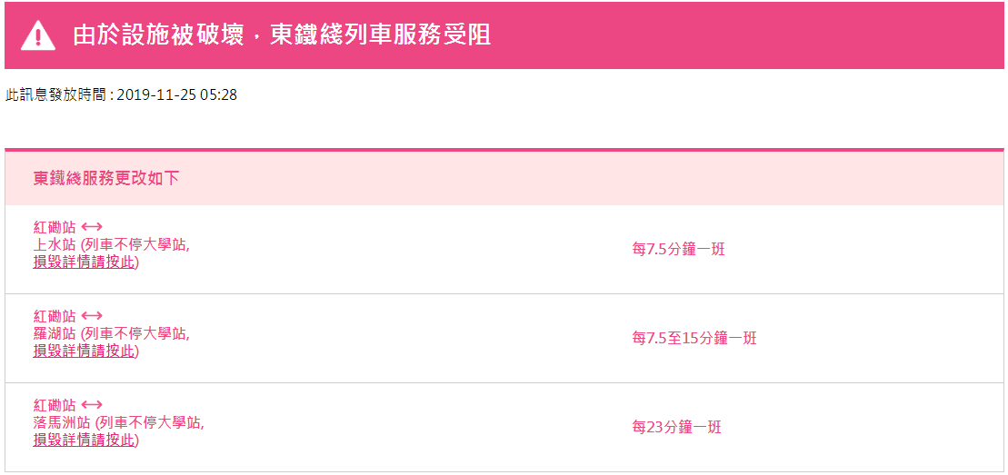 據(jù)港鐵消息,11月25日,香港地鐵各線(機場快線除外)、輕鐵及港鐵巴士的服務(wù)將于晚上11時結(jié)束。紅磡站恢復(fù)列車服務(wù),但只開放B、C出入口。大學(xué)站繼續(xù)關(guān)閉,列車不停大學(xué)站,個別車站出入口也會暫時關(guān)閉。