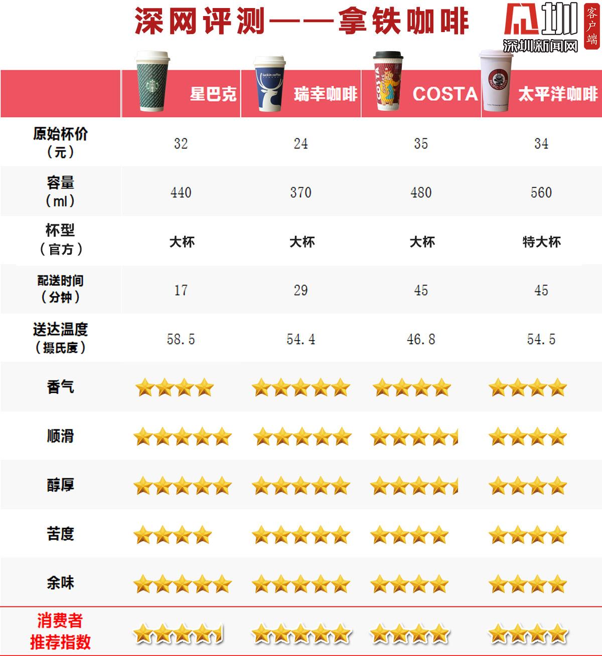 深圳新聞網(wǎng)測評小組聯(lián)合專注產(chǎn)品質(zhì)量、消費服務專業(yè)組織中國質(zhì)量萬里行,邀請了來自新聞、餐飲、IT以及其他行業(yè)的20位咖啡愛好者,對深圳市面上主流的星巴克、瑞幸、太平洋、COSTA4個品牌,2種口味【“拿鐵(熱)”、“美式(熱)”】的咖啡,通過主觀+客觀的形式進行了測評。