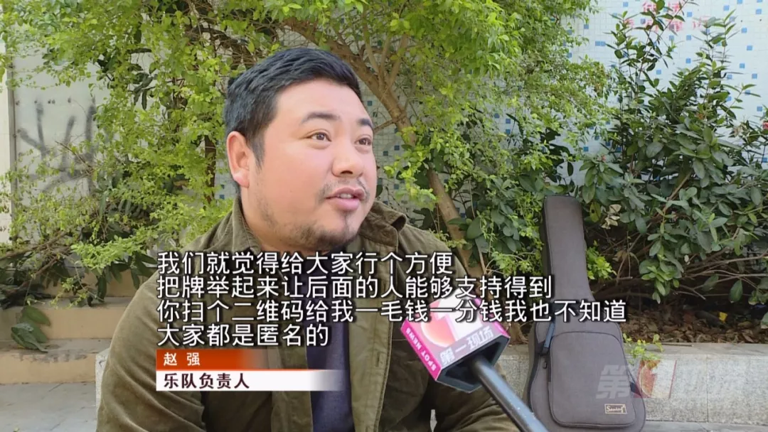 上周末,恰逢蓮花山簕杜鵑展,廣場人流量猛增,觀看樂隊演出的市民圍了好幾層,為了方便后排市民打賞,一名銀河樂隊的成員就把原本放在地上的二維碼拿在手上,在觀眾前繞了一圈,沒有強制索要打賞的意思。