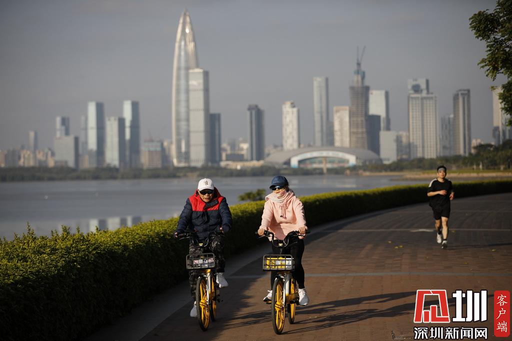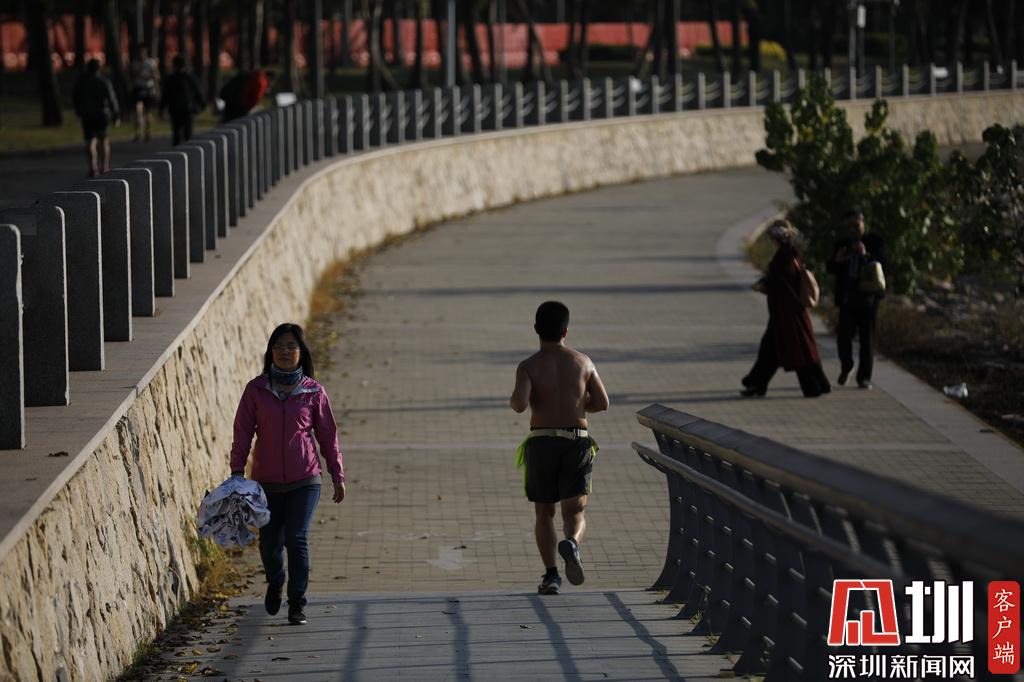 深圳灣公園,一位市民穿著羽絨服出行。