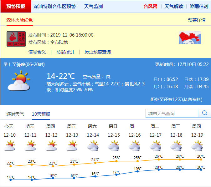 見(jiàn)圳客戶(hù)端·深圳新聞網(wǎng)2019年12月10日訊 今日深圳晴天間多云,空氣干燥;氣溫14-22℃;偏北風(fēng)2-3級(jí);相對(duì)濕度25%-70%。