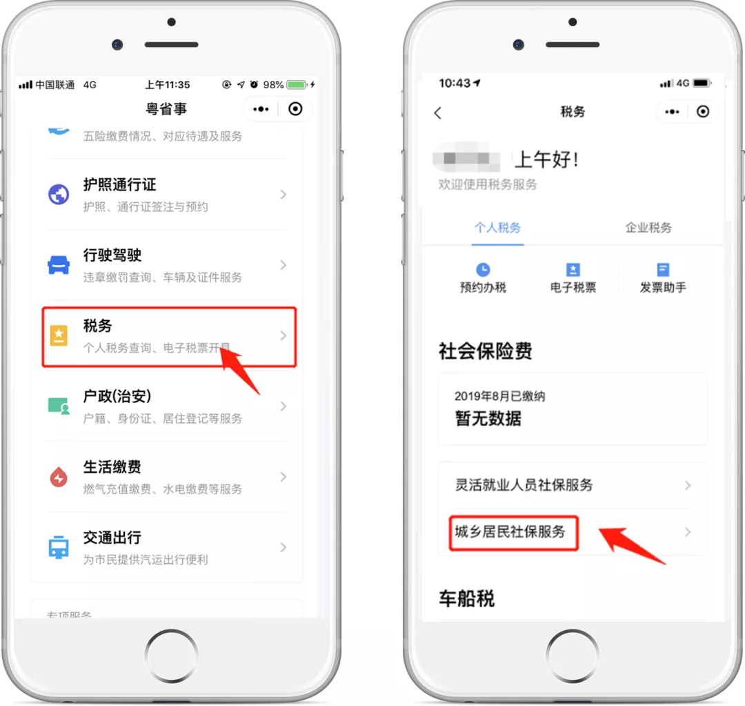 在“粵省事”小程序首頁點(diǎn)擊“稅務(wù)”服務(wù),在“個(gè)人稅務(wù)”板塊找到“社會(huì)保險(xiǎn)費(fèi)”—“城鄉(xiāng)居民社保服務(wù)”(暫不支持深圳地區(qū))。