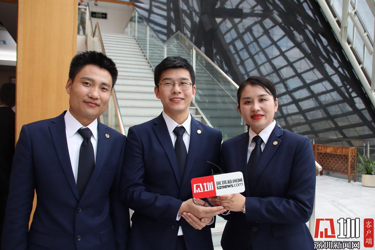 第一個辯題結(jié)束后,辯方辯手接受深圳新聞網(wǎng)記者采訪。從左到右依次為卜祥波、李銳杰、艾青三位律師。