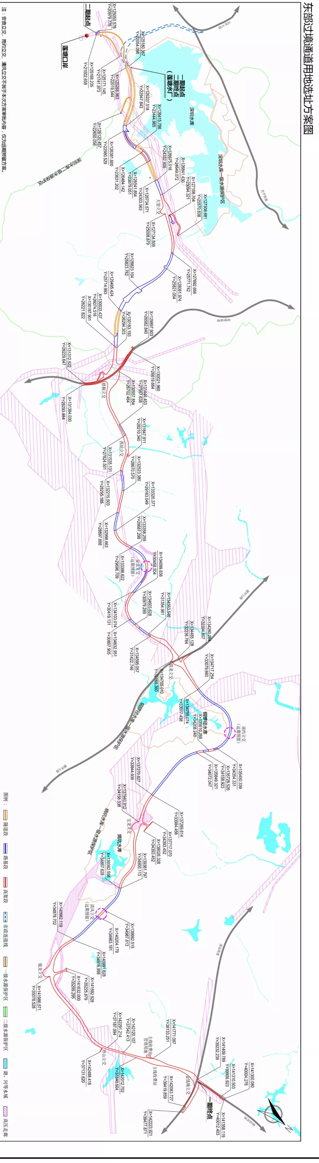 深圳市擬建設(shè)深圳市東部過境通道,途經(jīng)羅湖區(qū)蓮塘街道、黃貝街道和東湖街道,龍崗區(qū)橫崗街道、園山街道和寶龍街道,坪山區(qū)坪山街道,路線全長約32.2公里。