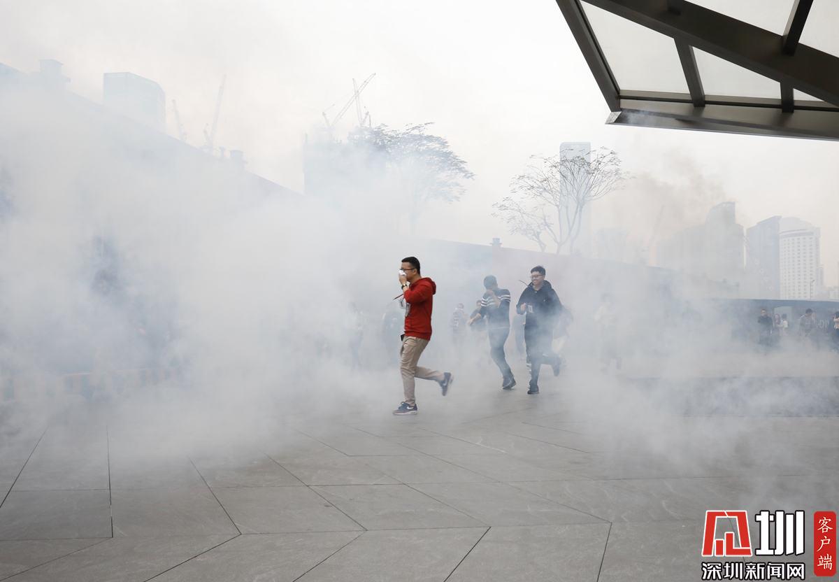 演練開始后,模擬中國華潤大廈24層因電氣線路發(fā)生短路,突發(fā)火災,火勢迅速蔓延。此時正值上班高峰期,樓內有大量辦公人員需要疏散救助,情況十分緊急。“火災”警報拉響后,大樓內部的微型消防站和技術處置隊進行先期處置。深圳市消防救援支隊同時快速調派特勤、南山、寶安、福田等大隊48輛消防車、230余名消防員到場處置,并聯動應急管理、交警、醫(yī)療、水務等部門到場協同處置。消防救援人員“逆行”深入起火建筑,疏散樓內5200余名群眾,同時按照“以固為主,固移結合”的戰(zhàn)術,利用水槍、水泡、滅火機器人、滅火無人機、舉高消防車、投彈式高層建筑干粉消防車等壓制火勢,最終成功將“大火”撲滅。