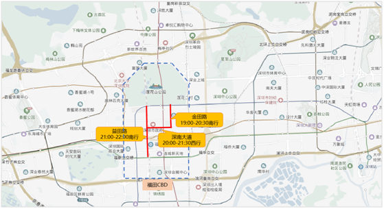 預(yù)計(jì)福田CBD區(qū)域春節(jié)假期周邊主要擁堵路段有金田路(19:00-20:30南行)、深南大道(20:00-21:30西行)、益田路(21:00-22:00南行)。具體分布如下: