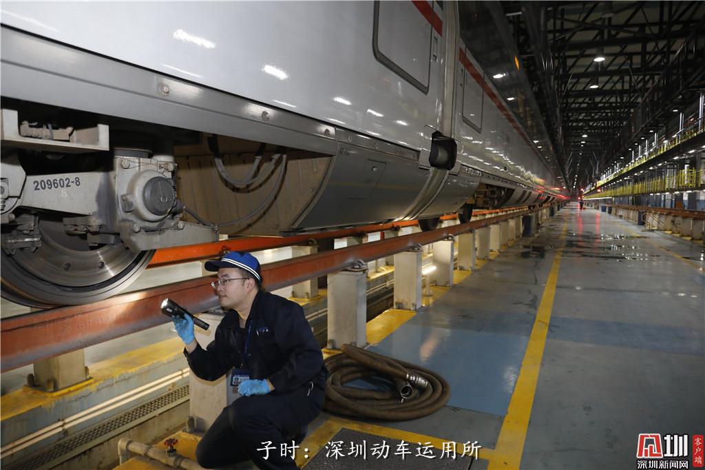 子時:凌晨0點26分,深圳動車運用所檢修車間內(nèi),動車地勤機械師陳愷正在給“下班”的動車檢修。據(jù)了解,深圳動車所的員工有600多人,平均年齡只有25歲,每年春節(jié),他們都要在動車所里度過。