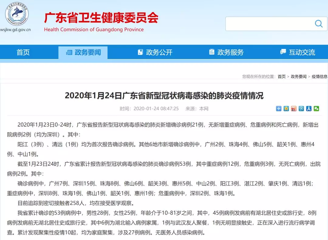 截至1月23日24時,廣東省累計報告新型冠狀病毒感染的肺炎確診病例53例,其中重癥病例12例,危重病例3例,無死亡病例,出院病例2例。其中: