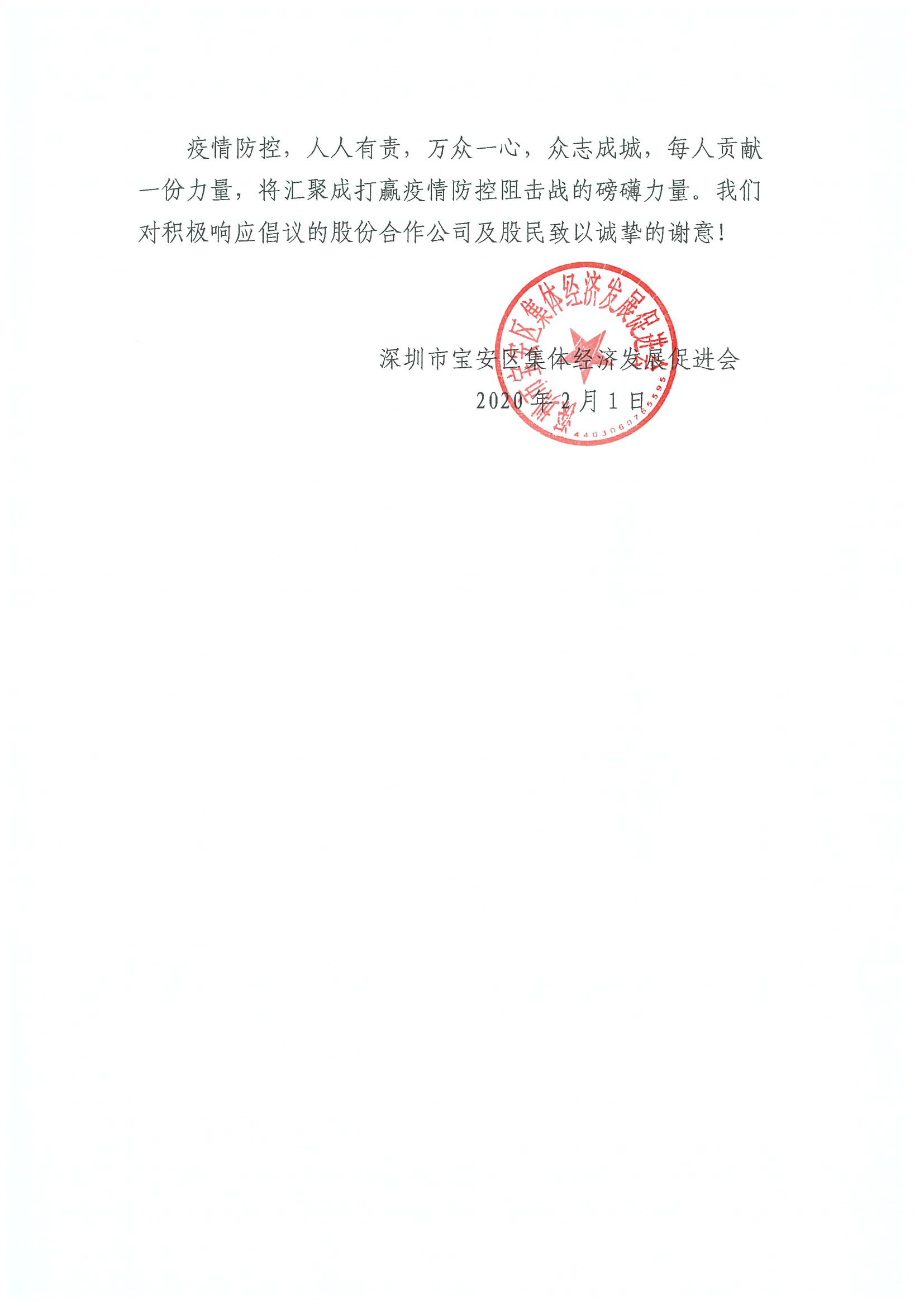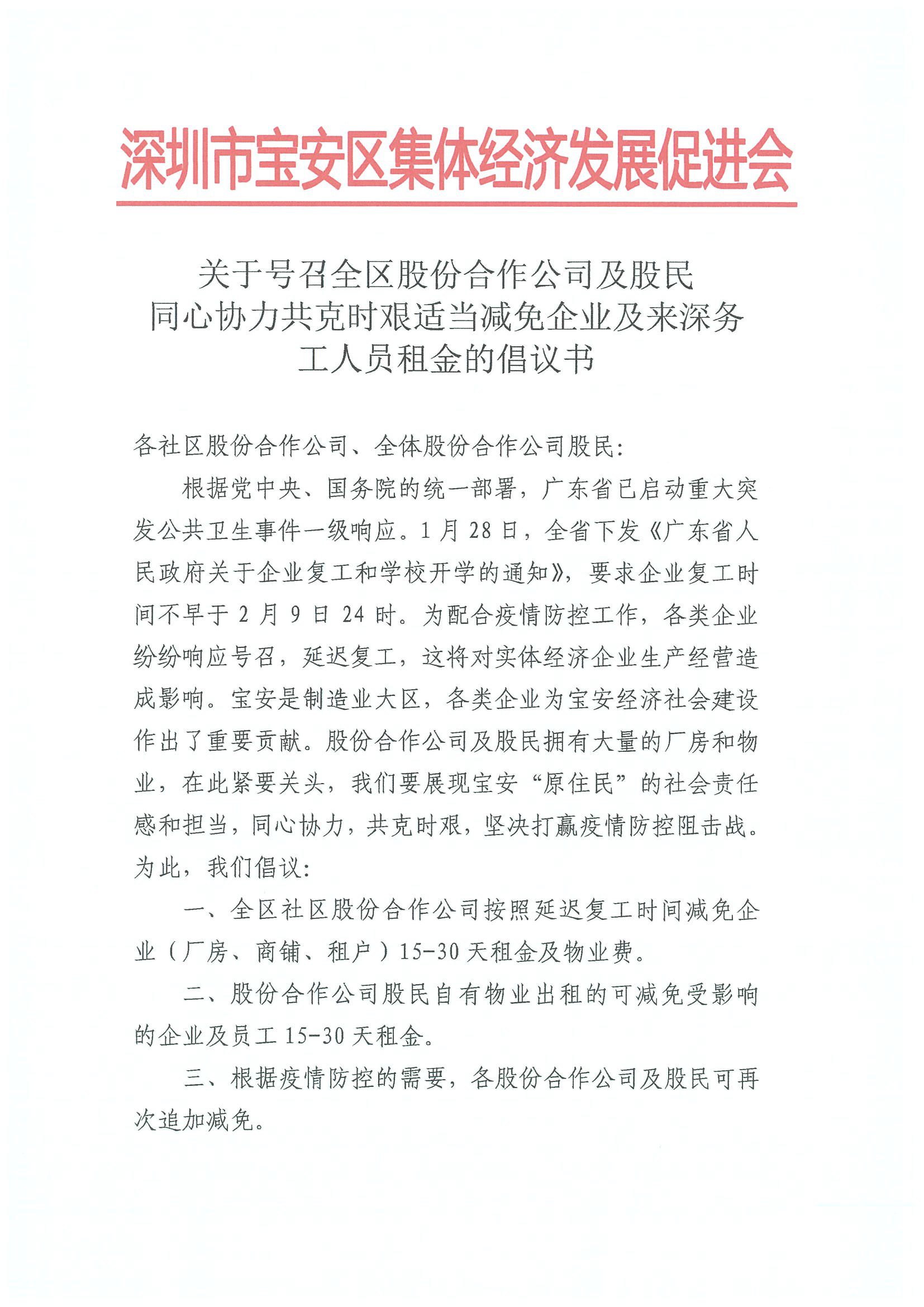 2月1日晚,寶安區(qū)集體資產(chǎn)管理局指導(dǎo)寶安區(qū)集體經(jīng)濟(jì)發(fā)展促進(jìn)會向?qū)毎矃^(qū)各社區(qū)股份合作公司、全體股份合作公司股民發(fā)出《同心協(xié)力共克時(shí)艱適當(dāng)減免企業(yè)及來深務(wù)工人員租金的倡議書》