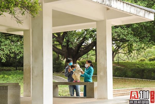 靈芝公園:一對(duì)夫妻戴著口罩來公園遛娃。