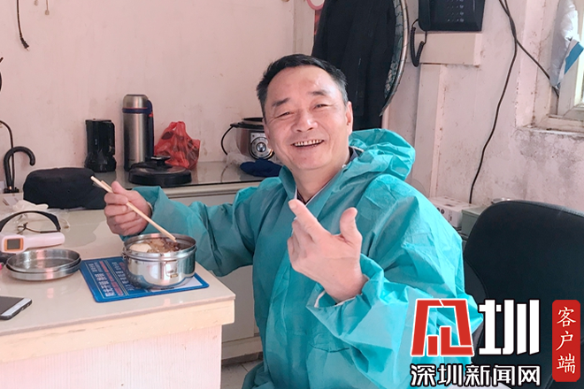 “吃飯沒有?還沒吃啊”“稍等下,要先測下體溫”……2月6日,龍崗區(qū)禾田路錦繡東方A區(qū)的保安廖師傅在崗位上忙著給出入的居民檢測體溫。廖師傅今年54歲,老家在廣東惠州,平常就住在附近小區(qū),在保安這個崗位上已經(jīng)工作了3年。