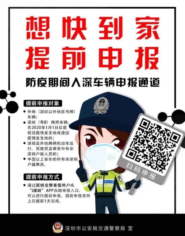 深圳交警提示,預(yù)計(jì)返深車流將逐漸增大,為了更快速的通過檢疫點(diǎn),建議即將返深的車主和廣大市民提前通過網(wǎng)上進(jìn)行申報(bào)。