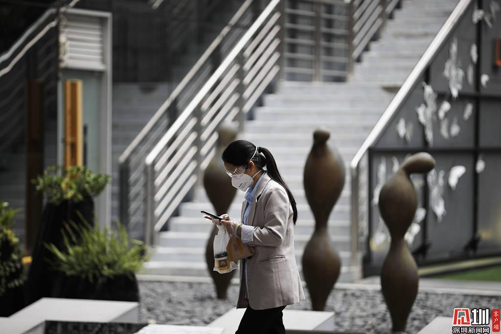 深圳軟件產(chǎn)業(yè)基地中,一位戴著口罩以及護目鏡的上班族。