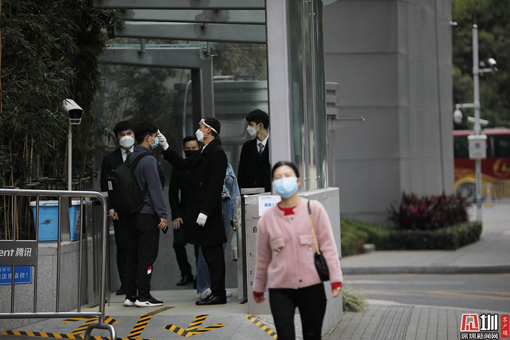 騰訊大廈的一個(gè)入口處,工作人員正在檢測(cè)體溫。