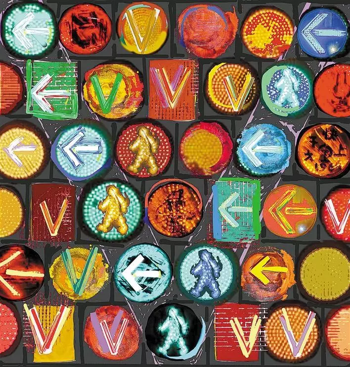 梁宇透露,這件作品的創(chuàng)作四易其稿,將信號燈所指代的“社會規(guī)則”加以排列強化,以此強調(diào)“秩序”本身在與疾病博弈混亂環(huán)境中的重要性。作品以濃烈的對比色彩、緊密排列的幾何圖形試圖傳達當(dāng)下人們的緊張情緒和焦慮心態(tài)。同時,信號燈中“行走”、“前進”、“Victory”的提示標識,被清晰地提煉出來,成為能讓畫面安定的因素,望帶給觀者一點思緒的寧靜與心靈的慰藉。