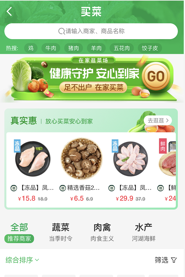 商品情況:店鋪相對(duì)較少,但果蔬肉禽海鮮齊全;另外,部分門(mén)店休息中,可先看看自己所在地區(qū)是否提供配送。