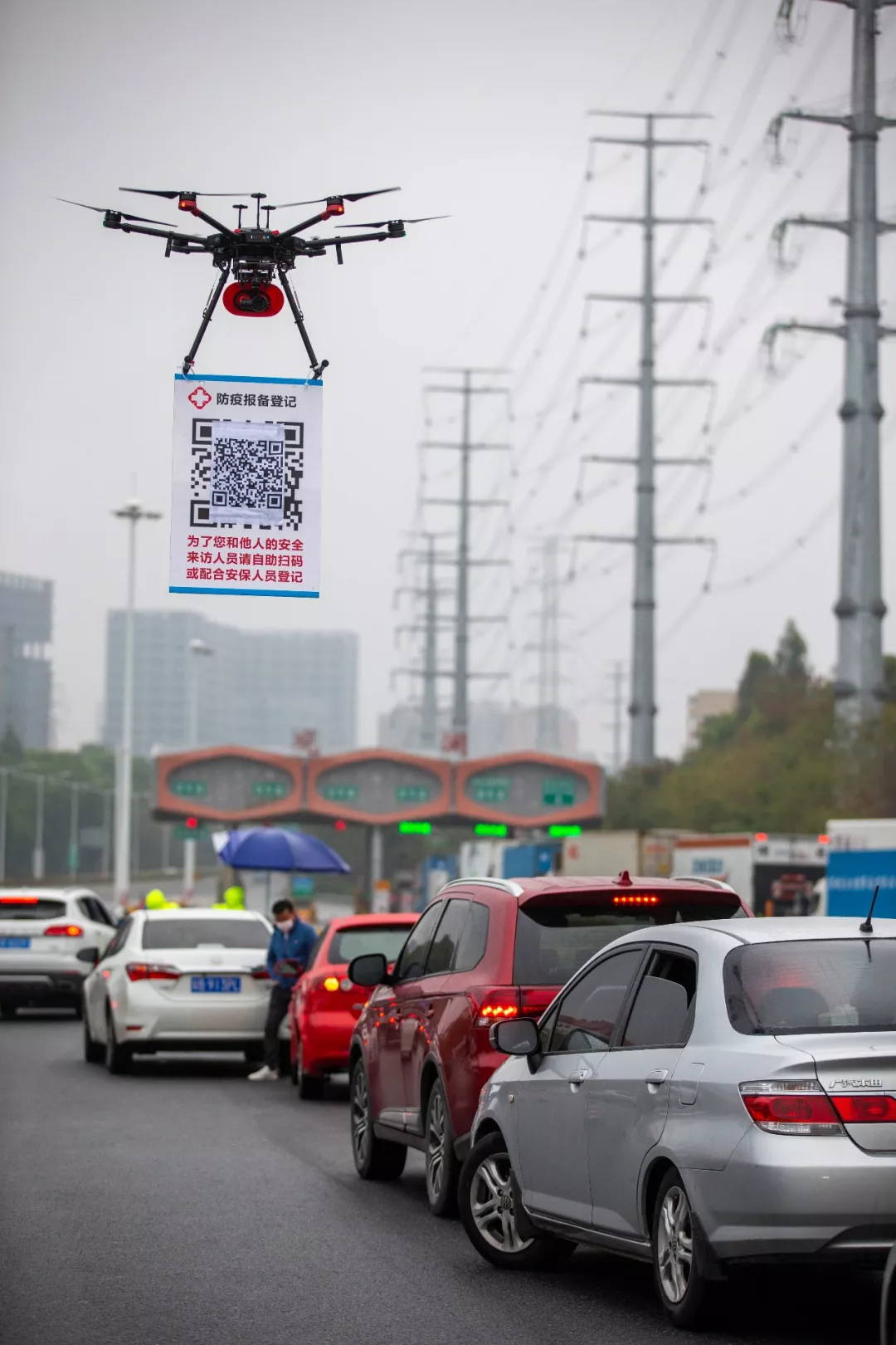 2月11日,在G94高速深圳觀瀾收費處,深圳龍華機訓(xùn)大隊無人機飛行隊的民警操作懸掛有申報二維碼的無人機在候檢的車輛間飛行。