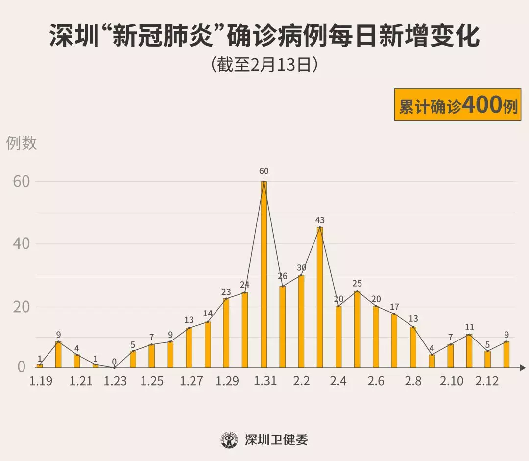 截至2月13日24時,深圳累計報告“新冠肺炎”確診病例400例。2月13日當(dāng)天全市新增確診病例9例(個案詳情今晚公布)。