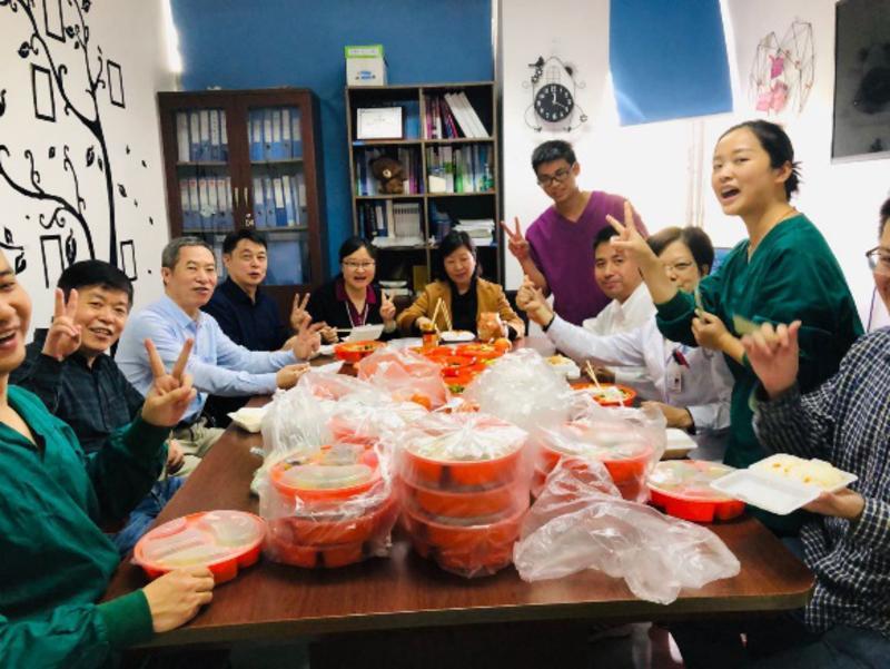 20:40,院領導和專家剛剛討論會診結束,病房同事也剛剛完成輪換交接。配餐室突然多了好多人,大家好像約好的似的,都不愿意回去自己過年。我們相聚一起,不分上下級,我們只是一群同事(其實,劉映霞副院長也在)一起吃除夕工作餐,一起過大年。