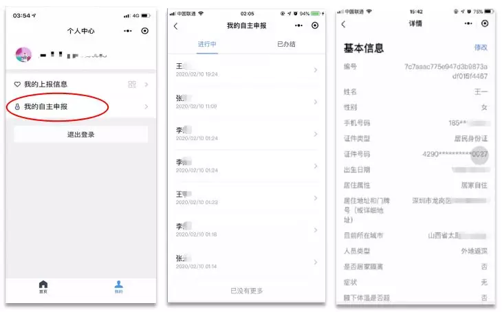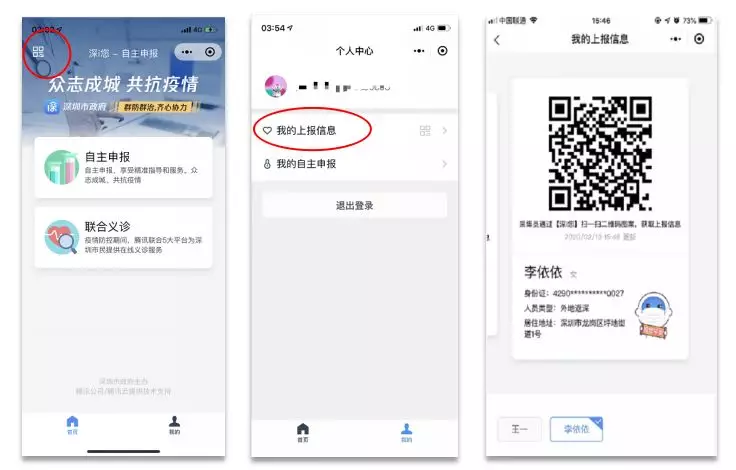 在進出小區(qū)時,可在“深i您-自主申報”小程序首頁點擊左上角“二維碼圖標”或前往“我的>個人中心”點擊“我的上報信息”向工作人員出示“深i您-自主申報”平臺生成的系統(tǒng)認證圖碼,憑該圖碼出入小區(qū),無需作重復(fù)申報。