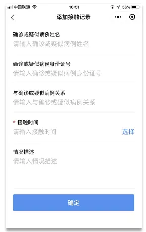 第三步:添加接觸記錄。若與確診或疑似病例有接觸過(guò),需要添加接觸記錄,如有多次接觸記錄,可按實(shí)際填寫(xiě)多條記錄。